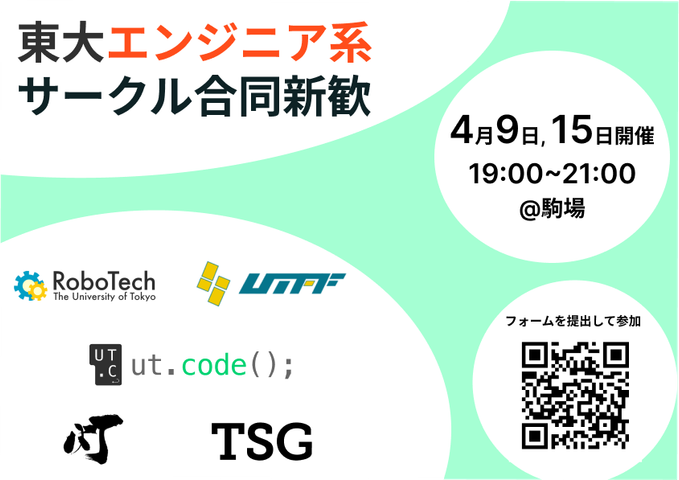 📌 イベント概要 📅 開催日時 4/9 (水) 18:50 開場 / 19:00 〜 21:00 4/15 (火) 18:50 開場 / 19:00 〜 21:00 🏢 開催場所 📍 駒場キャンパスの教室予定 4/9 (水): 駒場キャンパス 1102 教室 4/15 (火): 未定教室が確定し次第お知らせいたします。 抽選があるため、もし会場が確保できなかった場合は大学外の会場に変更する場合があります。 📝 イベント内容 サークル紹介プレゼン(各サークル 5 分程度) 活動内容、雰囲気、過去のプロジェクトなどを紹介! 座談会(1セクション 10 分) 新入生をグ...